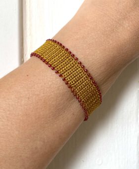 Dieses Armband wird aus feinem Garn sorgfältig von Hand gehäkelt. Entlang der Ränder sind Vintage Perlen eingearbeitet, die dem Schmuckstück einen eleganten Schimmer verleihen.