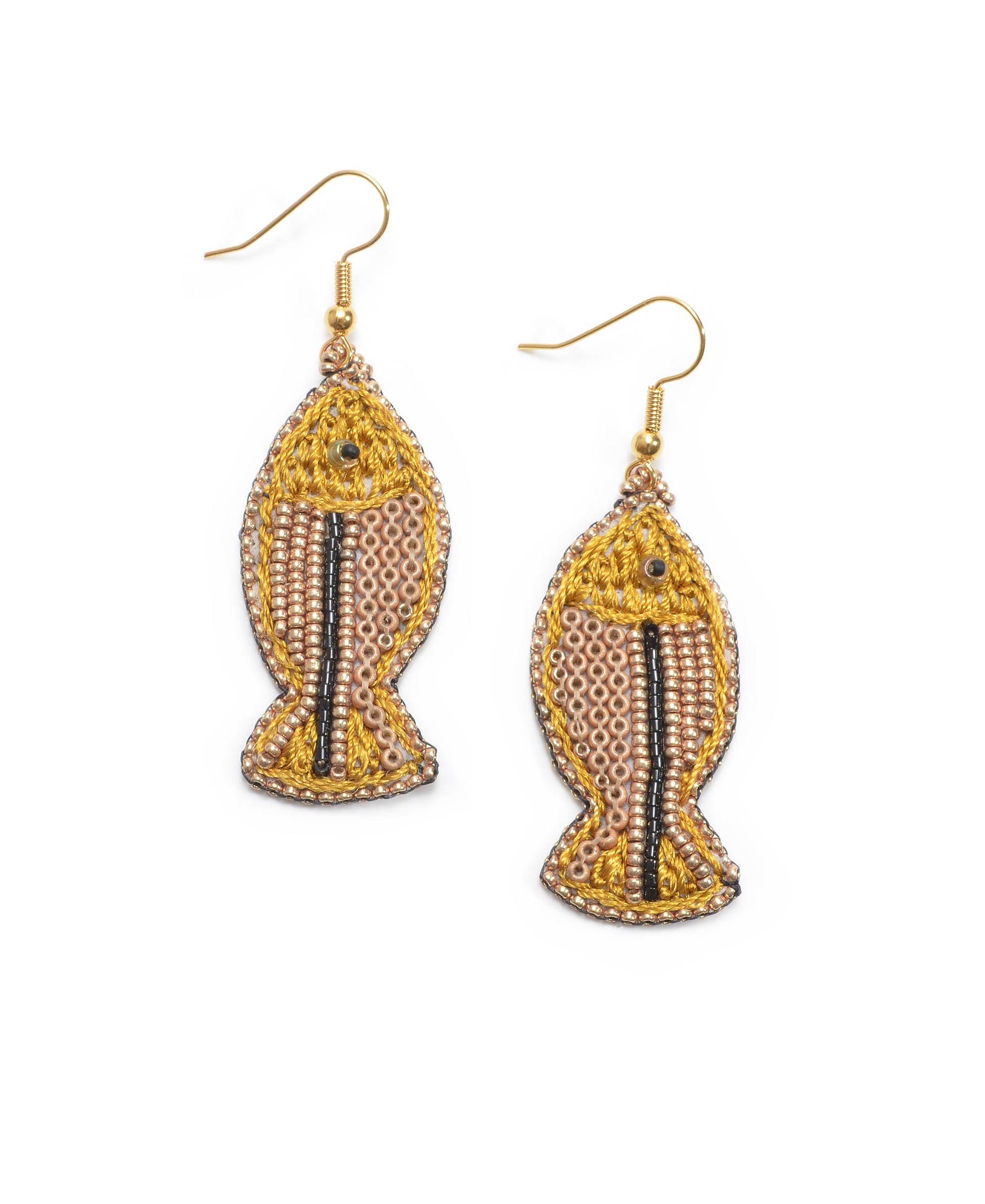 Edle von Hand mit winzigen Perlen bestickte Fisch Ohrringe in currygelb-gold.